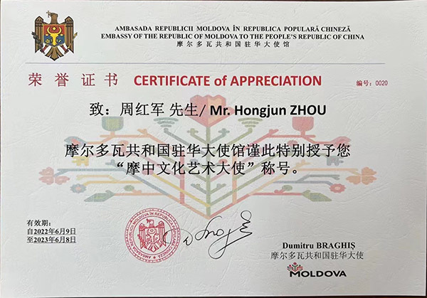 ? ? ? ?周红军先生愉快的接受“摩中文化艺术大使”证书并表态:“非常感谢摩尔多瓦大使馆的信任,一定紧紧围绕摩尔多瓦共和国建国三十周年这个主题,加强双方文化,经贸的交流合作,请进来、走出去适当机会带领艺术家、企业家到摩尔多瓦参观学习交流和项目合作,让中摩友谊源源流长”。